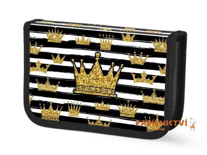 Jednopatrový nevybavený školní penál v černobílé barvě se dvěma chlopněmi s motivem zlatých korunek. Chlopně mají na vnější straně praktickou průhlednou kapsičku určenou na...
