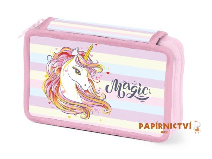 Školní dvoupatrový nevybavený penál s obrázkem jednorožce. Penál obsahuje 24 poutek na psací potřeby a 3 větší např. na pravítko, ořezávátko, gumu nebo nůžky. Uzavírá se pomocí...