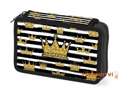 Školní dvoupatrový nevybavený penál v černobílé barvě s motivem zlatých korunek. Penál obsahuje 24 poutek na psací potřeby a 3 větší např. na pravítko, ořezávátko, gumu nebo...