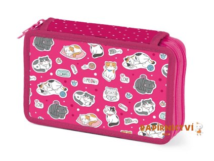 Školní dvoupatrový nevybavený penál v sytě růžové barvě s motivem koček. Penál obsahuje 24 poutek na psací potřeby a 3 větší např. na pravítko, ořezávátko, gumu nebo nůžky....