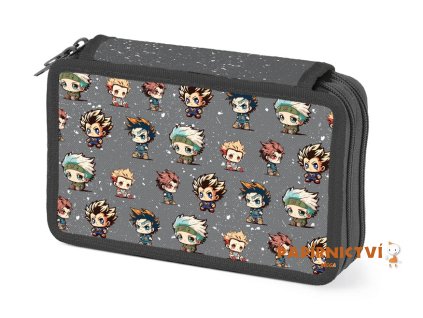 Školní dvoupatrový nevybavený penál v tmavě šedé barvě s motivem anime maskotů. Penál obsahuje 24 poutek na psací potřeby a 3 větší např. na pravítko, ořezávátko, gumu nebo...