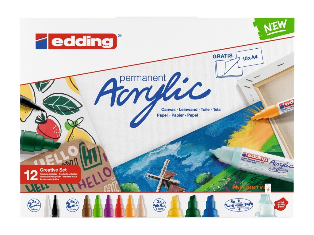 Velká sada 12 akrylových popisovacu edding 5000 B, 5100 M, 5300 F a 5400 3D v základních barvách pro spontánní kreativitu na svetlých i tmavých površích materiálu jako je plátno, malírský papír, hladké drevo a kámen. Vysoce kvalitní pigmentovaná akrylová barva na bázi vody je po zaschnutí permanentní, svetlostálá a bez zápachu. Vhodné pro kreativní vyjádrení umelcu i laiku. Barva ve forme pumpovacího fixu se snadno nanáší. Popisovac je vždy pripraven k použití, nejsou potreba žádné štetce a další potreby. Stací otevrít, zapumpovat a rovnou malovat. Ventilový systém umožnuje rovnomerný tok inkoustu. Sada Creative obsahuje: vysoce kryvé barvy (cerná, dopravní cervená, cervenofialová, oríšková, žlutozelená, mechová zelená, enziánová modrá) a polopruhledné barvy (dopravní bílá, slunecní žlutá, béžová, dopravní žlutá, pastelová modrá). Odolný seríznutý hrot se šírkou stopy 5-10 mm umožnuje variabilní tahy a malování vetších ploch, odolný kulatý hrot se šírkou stopy 2-3 mm umožnuje precizní tahy, odolný kulatý hrot se šírkou stopy 1-2 mm je ideální na kreslení kontur a dalších detailu s lehkostí. Inovativní tuba edding 5400 má dva ruzne široké otvory, které umožnují dosažení plastického efektu o šírce stopy 2-3 a 5-10 mm. Lze kombinovat s ostatními akrylovými popisovaci a spreji edding 5200. Použití je velmi jednoduché: u popisovace sejmete ochrannou fólii, pred odstranením vícka dukladne protrepejte, zapumpujte hrotem popisovace nejlépe o podložku s papírem, dokud hrot dostatecne nenasákne inkoustem. U tuby sejmete ochrannou fólii, sejmete jedno vícko, jemne stlacte tubu, dokud barva nevyjde hrotem. Vždy používejte pouze s jedním sejmutým víckem. Tip: využijte akrylový popisovac edding 5000 B pro prolínání a mísení ruzných barev. Po nanesení barvy akrylového fixu edding 5100 M nebo 5300 F vyckejte 3 vteriny a pres nezaschlou stopu rovnou prejedte seríznutým hrotem fixu edding 5000. Tím dosáhnete plynulého propojení techto dvou barev. Skladujte vodorovne a pri pokojové teplote. Náhradní hroty pro popisovace jsou dostupné samostatne. Sada obsahuje 2x popisovac e-5300 F s tenkým hrotem (cerná, dopravní bílá), 6x e-5100 M se stredním hrotem (lískový oríšek, zelenožlutá, cervenofialová, dopravní cervená, slunecní žlutá, béžová), 3x e-5000 B se širokým hrotem (dopravní žlutá, mechove zelená, enziánová modr) a oboustranná 3D tuba v pastelove modré barve. Vyrobeno v Nemecku.Doplňkové parametry