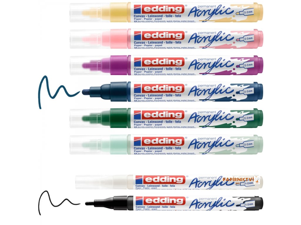 Sada 8 akrylových popisovacu edding 5100 a 5300 v tlumených barvách pro spontánní kreativitu na svetlých i tmavých površích materiálu jako je plátno, malírský papír, hladké drevo a kámen. Vysoce kvalitní pigmentovaná akrylová barva na bázi vody je po zaschnutí permanentní, svetlostálá a bez zápachu. Vhodné pro kreativní vyjádrení umelcu i laiku. Barva ve forme pumpovacího fixu se snadno nanáší. Popisovac je vždy pripraven k použití, nejsou potreba žádné štetce a další potreby. Stací otevrít, zapumpovat a rovnou malovat. Ventilový systém umožnuje rovnomerný tok inkoustu. Sada Nordic obsahuje: vysoce kryvé barvy (elegantní nocní modrá, cervenofialová, mechová zelená, cerná) a polopruhledné barvy (jemná mátová, klasická slézová, pastelová žlutá, dopravní bílá). Odolný kulatý hrot se šírkou stopy 2-3 mm umožnuje precizní tahy, odolný kulatý hrot se šírkou stopy 1-2 mm je ideální na kreslení kontur a dalších detailu s lehkostí. Lze kombinovat s ostatními akrylovými popisovaci a spreji edding 5200. Použití je velmi jednoduché: sejmete ochrannou fólii, pred odstranením vícka popisovac dukladne protrepejte, zapumpujte hrotem popisovace nejlépe o podložku s papírem, dokud hrot dostatecne nenasákne inkoustem. Tip: využijte akrylový popisovac edding 5000 pro prolínání a mísení ruzných barev. Po nanesení barvy akrylového fixu edding 5100 nebo 5300 vyckejte 3 vteriny a pres nezaschlou stopu rovnou prejedte seríznutým hrotem fixu edding 5000. Tím dosáhnete plynulého propojení techto dvou barev. Skladujte vodorovne a pri pokojové teplote. Náhradní hroty jsou dostupné samostatne. Sada obsahuje 2x popisovac e-5300 F s tenkým hrotem (cerná, dopravní bílá) a 6x e-5100 M (jemne mátová, mechove zelená, nocní modr, cervenofialová, slézová, pastelove žlutá). Vyrobeno v Nemecku.Doplňkové parametry