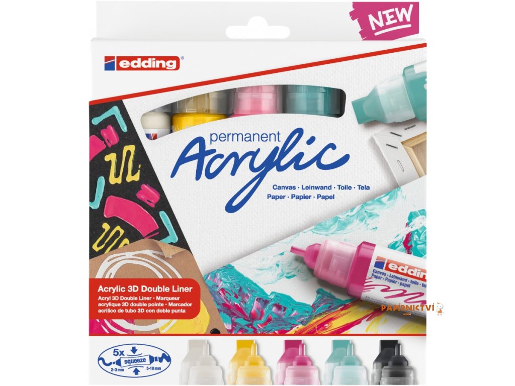 Sada 5 akrylových barev v oboustranné tube edding 5400 v moderních základních barvách vytvárí 3D efekt bez nutnosti použití štetce. Akrylová tuba je využitelná pro spontánní kreativitu na svetlých i tmavých površích materiálu jako je plátno, malírský papír, hladké drevo a kámen. Vhodné pro kreativní vyjádrení umelcu i laiku. Vysoce kvalitní pigmentovaná akrylová barva krémové konzistence na bázi vody je po zaschnutí permanentní, svetlostálá a bez zápachu. Sada Modern Basic obsahuje: vysoce kryvé barvy (cerná, pompézní tyrkysová, telemagenta) a polopruhledné barvy (dopravní bílá, dopravní žlutá). Inovativní tuba má dva ruzne široké otvory, které umožnují dosažení plastického efektu o šírce stopy 2-3 a 5-10 mm. Jednotlivé barvy edding 5400 lze navzájem míchat pro dosažení nových odstínu, jsou také reditelné vodou. Navíc je možné je kombinovat s ostatními akrylovými popisovaci a spreji edding 5200. Použití je velmi jednoduché: sejmete ochrannou fólii, sejmete jedno vícko, jemne stlacte tubu, dokud barva nevyjde hrotem. Vždy používejte pouze s jedním sejmutým víckem. Skladujte vodorovne a pri pokojové teplote. Obsah: 45 ml. Vyrobeno v Nemecku.Doplňkové parametry