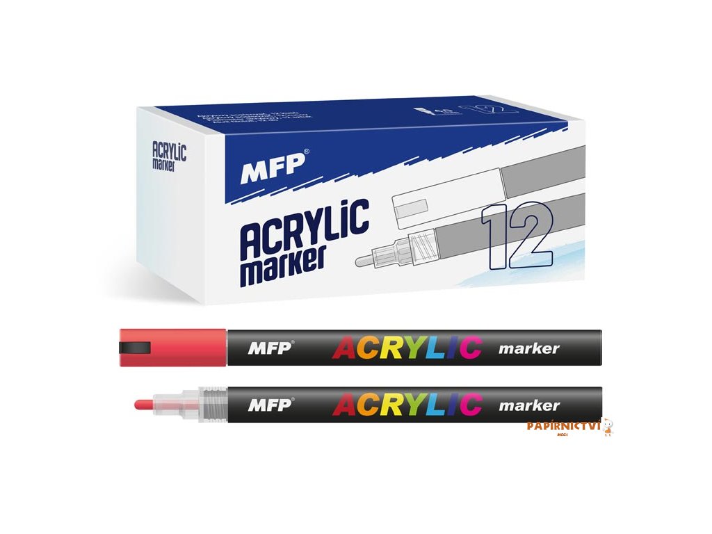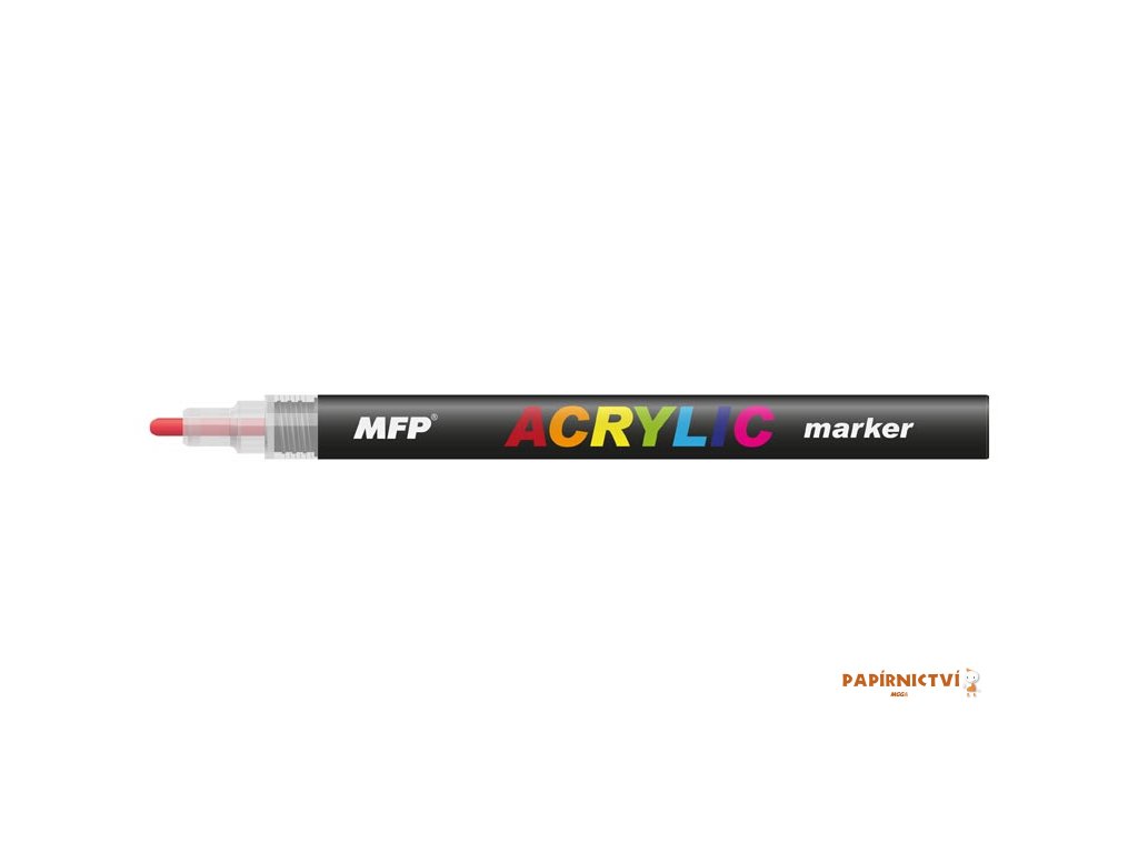 Akrylový červený popisovač. Tyto akrylové popisovače se vyznačují svou barevnou sytostí i stálostí, a velmi dobrými krycími schopnostmi. Jsou vhodné na všechny nemastné a hladké povrchy, jako jsou plátna, papír, dřevo, kámen atd.