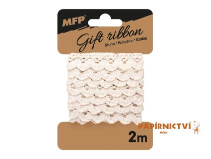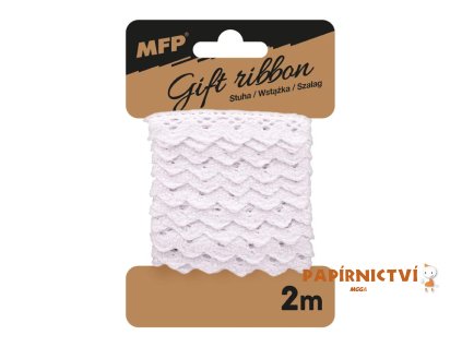Krajková, bavlněná stuha v bílé barvě. Vhodná pro svatební dekorace, ruční šití, zdobení oděvů, k zabalení dárku nebo zavázání květin. Krajková stuha je opakovatelně použitelná.