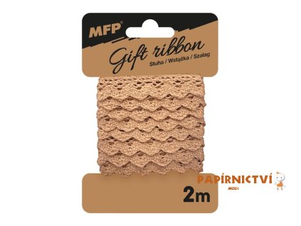 Krajková, bavlněná stuha v hnědé barvě. Vhodná pro svatební dekorace, ruční šití, zdobení oděvů, k zabalení dárku nebo zavázání květin. Krajková stuha je opakovatelně použitelná.