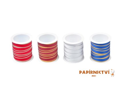 Vázací stuha Luxur s okrajem. Jedná se o dekorativní stuhu v různých barvách se zlatými nebo stříbrnými okraji, která se používá pro dárkové balení a podobné účely. Tyto okraje...