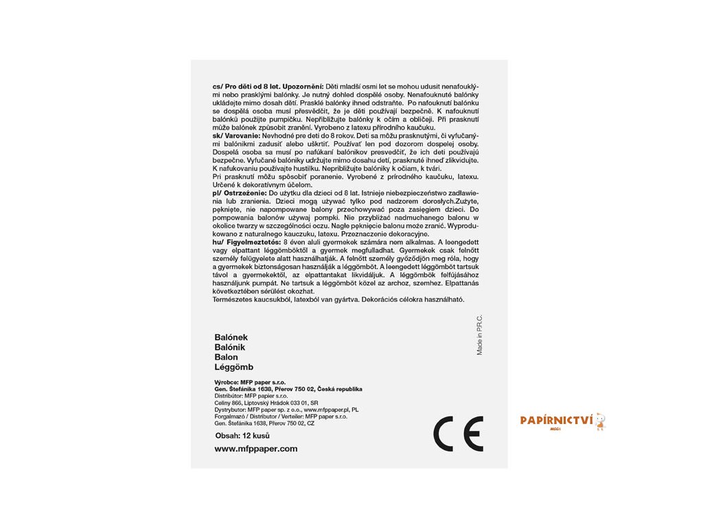Vhodné pro děti od 8 let. Děti se mohou prasklými či vyfouknutými balónky zadusit nebo uškrtit. Používejte pouze pod dozorem dospělé osoby. Dospělá osoba se po nafouknutí balónku musí přesvědčit, že jej děti používají bezpečně. Vyfouklé balónky udržujte mimo dosah dětí a prasklé ihned zlikvidujte. K nafukování balónků použíjte pumpičku. Nepřibližujte balónky k očím a obličeji. Při prasknutí může balónek způsobit zranění. Vyrobeno z přírodního kaučuku, latexu. Určeno k dekorativním účelům. Nebezpečí vdechnutí a spolknutí malých částic.