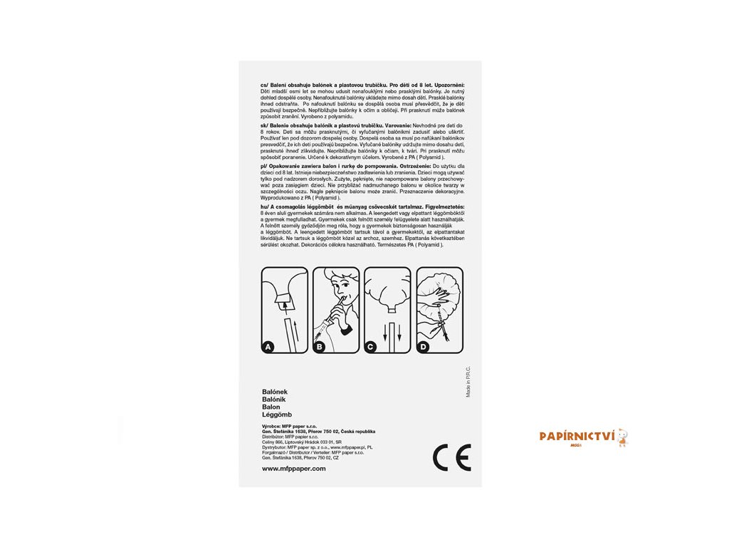 Vhodné pro děti od 8 let. Děti se mohou prasklými či vyfouknutými balónky zadusit nebo uškrtit. Používejte pouze pod dozorem dospělé osoby. Dospělá osoba se po nafouknutí balónku musí přesvědčit, že jej děti používají bezpečně. Vyfouklé balónky udržujte mimo dosah dětí a prasklé ihned zlikvidujte. K nafukování balónků použijte pumpičku. Nepřibližujte balónky k očím a obličeji. Při prasknutí může balónek způsobit zranění. Vyrobeno z přírodního kaučuku, latexu. Určeno k dekorativním účelům. Nebezpečí vdechnutí a spolknutí malých částic.