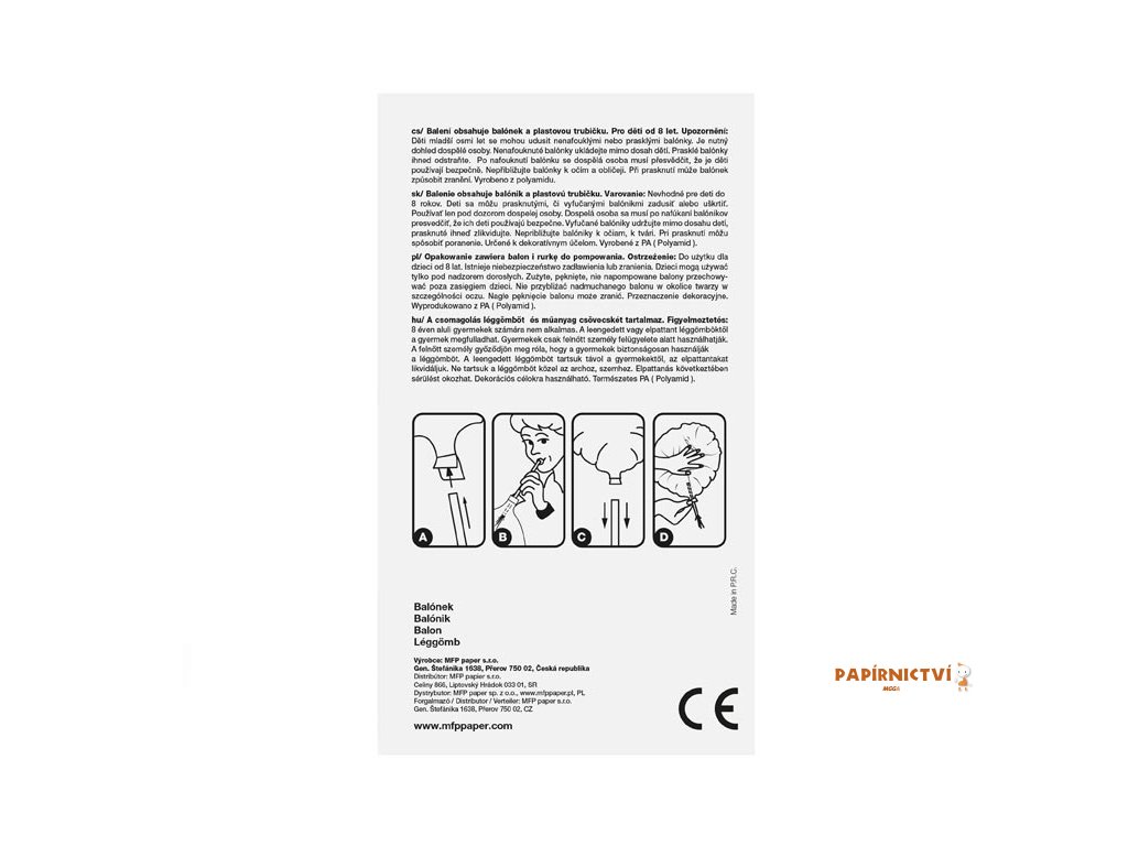 Vhodné pro děti od 8 let. Děti se mohou prasklými či vyfouknutými balónky zadusit nebo uškrtit. Používejte pouze pod dozorem dospělé osoby. Dospělá osoba se po nafouknutí balónku musí přesvědčit, že jej děti používají bezpečně. Vyfouklé balónky udržujte mimo dosah dětí a prasklé ihned zlikvidujte. K nafukování balónků použijte pumpičku. Nepřibližujte balónky k očím a obličeji. Při prasknutí může balónek způsobit zranění. Vyrobeno z přírodního kaučuku, latexu. Určeno k dekorativním účelům. Nebezpečí vdechnutí a spolknutí malých částic.