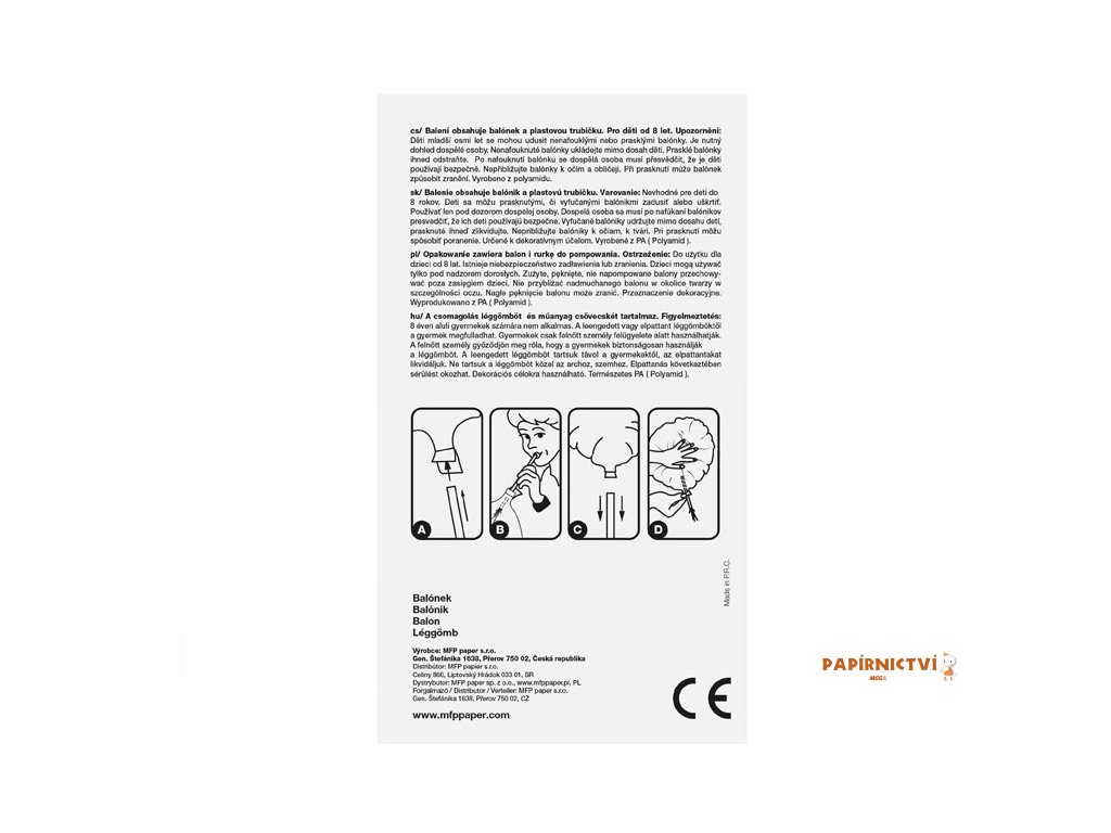 Vhodné pro děti od 8 let. Děti se mohou prasklými či vyfouknutými balónky zadusit nebo uškrtit. Používejte pouze pod dozorem dospělé osoby. Dospělá osoba se po nafouknutí balónku musí přesvědčit, že jej děti používají bezpečně. Vyfouklé balónky udržujte mimo dosah dětí a prasklé ihned zlikvidujte. K nafukování balónků použijte pumpičku. Nepřibližujte balónky k očím a obličeji. Při prasknutí může balónek způsobit zranění. Vyrobeno z přírodního kaučuku, latexu. Určeno k dekorativním účelům. Nebezpečí vdechnutí a spolknutí malých částic.