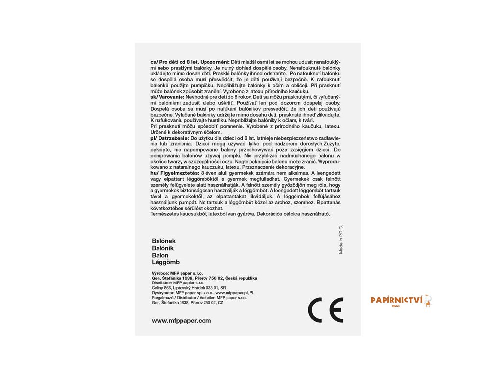 Vhodné pro děti od 8 let. Děti se mohou prasklými či vyfouknutými balónky zadusit nebo uškrtit. Používejte pouze pod dozorem dospělé osoby. Dospělá osoba se po nafouknutí balónku musí přesvědčit, že jej děti používají bezpečně. Vyfouklé balónky udržujte mimo dosah dětí a prasklé ihned zlikvidujte. K nafukování balónků použíjte pumpičku. Nepřibližujte balónky k očím a obličeji. Při prasknutí může balónek způsobit zranění. Vyrobeno z přírodního kaučuku, latexu. Určeno k dekorativním účelům. Nebezpečí vdechnutí a spolknutí malých částic.