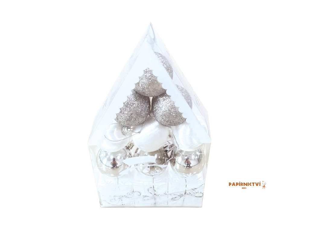 Vánoční baňky ve stříbrné a bílé barvě. Zkrášlí váš vánoční stromek a vytvoří tak vánoční atmosféru. Snadno se zavěsí pomocí šňůrky na stromek. Jsou vhodné i ke zdobení věnců a vánočních svícnů. Baňky jsou balené v praktickém plastovém obalu ve tvaru domečku s vánočním vzorem.BALENÍ OBSAHUJE: