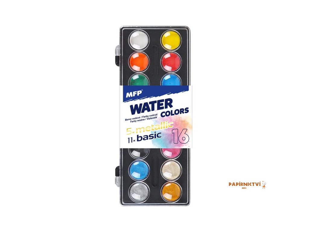 Sada vodových barev, 11 klasických a 5 metalických barev, velikost puku 23 mm. Barvy jsou vhodné zejména na malbu na papír či karton. Namalujte si s dětmi obrázek pomocí vodových barev, které vynikají jasnou barevností. Děti se zabaví a navíc rozvinou motoriku ruky a svou fantazii.- vhodné pro školní a hobby použití