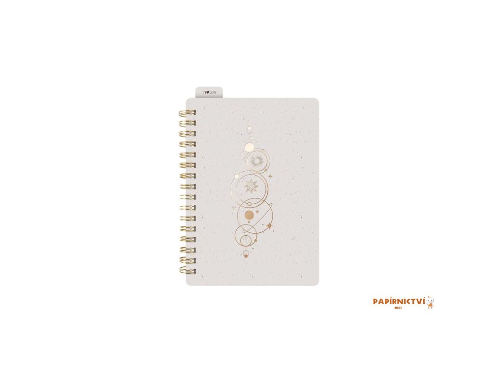 Designový poznámkový blok ve formátu A6 s linkovanými stránkami, spirálovou vazbou a praktickou gumičkou je ideální pro záznamy na cestách nebo každodenní použití. Obálka v jemné krémové barvě je zdobena zlatým motivem vesmírných symbolů, který bloku přináší jedinečný a vkusný vzhled. Spirálová vazba umožňuje snadné otáčení stránek, zatímco praktická gumička drží blok bezpečně zavřený, aby byly vaše poznámky chráněny. Záložka s nápisem „notes“ vám usnadní orientaci a poskytne rychlý přístup k důležitým stránkám. Díky kompaktnímu formátu se blok snadno vejde do kabelky nebo batohu, takže ho můžete mít vždy po ruce.