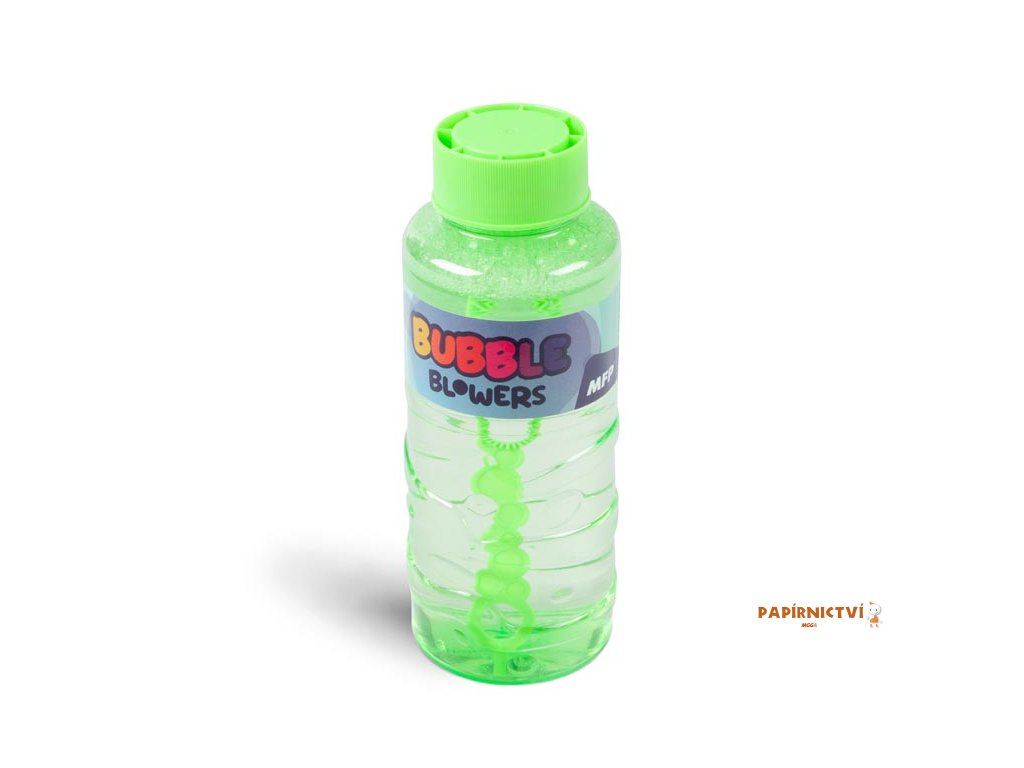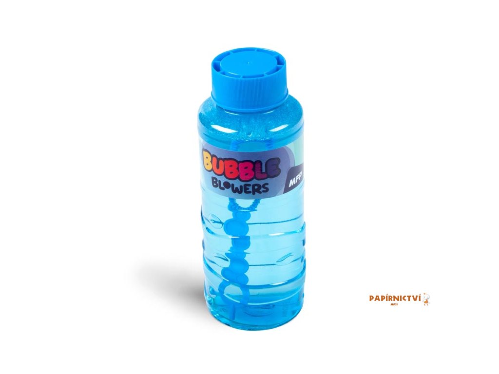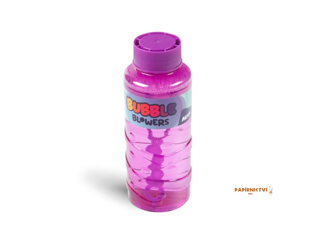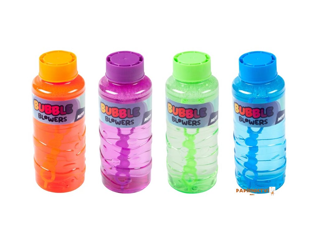 Lahev obsahuje hotovou náplň a praktické foukátko s několika kroužky – stačí otevřít a začít foukat. Dostupná v několika veselých barvách – oranžové, fialové, zelené a modré.