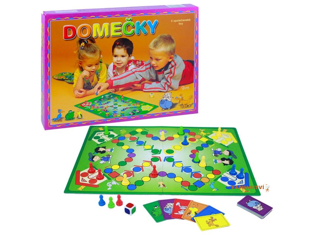 SPOLEČENSKÁ HRA DOMEČKY V KRABIČCE Sada obsahující dvě oblíbené společenské hry pro děti, které ještě neumí počítat. Obě hry jsou variací na známou a oblíbenou hru Člověče, nezlob se.