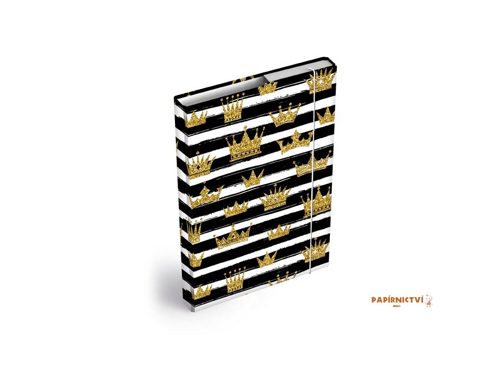 Školní desky na sešity ve velikosti A4 s motivem zlaté korunky. Nezbytná součást vybavení každého školáka. Díky školním deskám budou všechny sešity a učebnice pohromadě a neponičené. Tyto desky na sešity jsou opatřeny gumou, která zabraňuje samovolnému otevření. Heft box je vyroben z kvalitního lepenkového kartonu, potaženého laminem. Z tohoto důvodu se dá velice lehce udržovat.Materiál: lepenkový karton s laminem