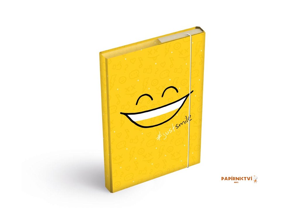 Školní desky na sešity ve velikosti A4 s motivem úsměvu a nápisem just smile. Nezbytná součást vybavení každého školáka. Díky školním deskám budou všechny sešity a učebnice pohromadě a neponičené. Tyto desky na sešity jsou opatřeny gumou, která zabraňuje samovolnému otevření. Heft box je vyroben z kvalitního lepenkového kartonu, potaženého laminem. Z tohoto důvodu se dá velice lehce udržovat.Materiál: lepenkový karton s laminem