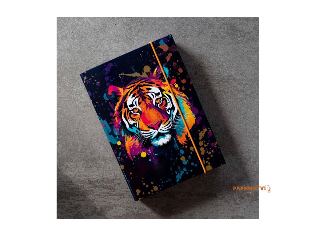 Buďte ve škole nepřehlédnutelní!Tento odvážný box na sešity ve formátu A4 nese sílu a dravost tygra v explozivním barevném provedení. Už žádné zmuchlané rohy nebo rozházené papíry – pevný karton s laminem ochrání obsah, zatímco pružná gumička vše udrží tam, kde má.