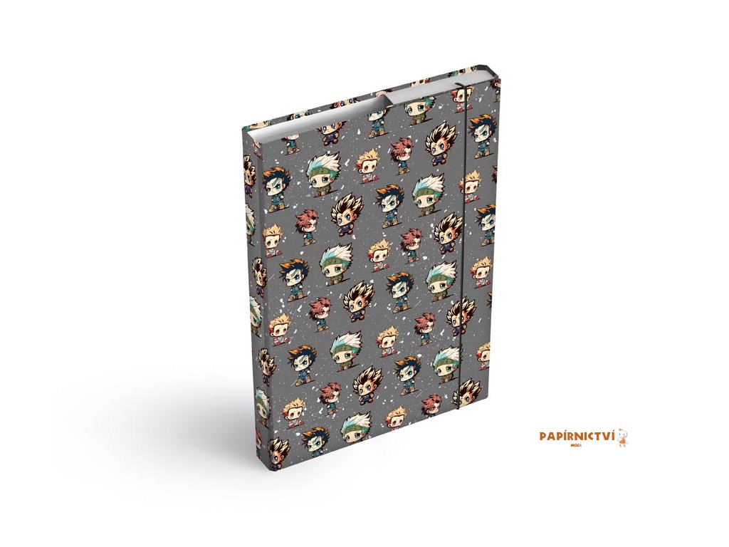 Školní tmavě šedé desky na sešity ve velikosti A5 s motivem anime maskotů. Jsou nezbytnou součástí vybavení každého školáka. Díky školním deskám budou všechny sešity a učebnice pohromadě a neponičené. Tyto desky na sešity jsou opatřeny gumou, která zabraňuje samovolnému otevření. Heft box je vyroben z kvalitního lepenkového kartonu, potaženého laminem. Z tohoto důvodu se dá velice lehce udržovat.Barva: tmavě šedá