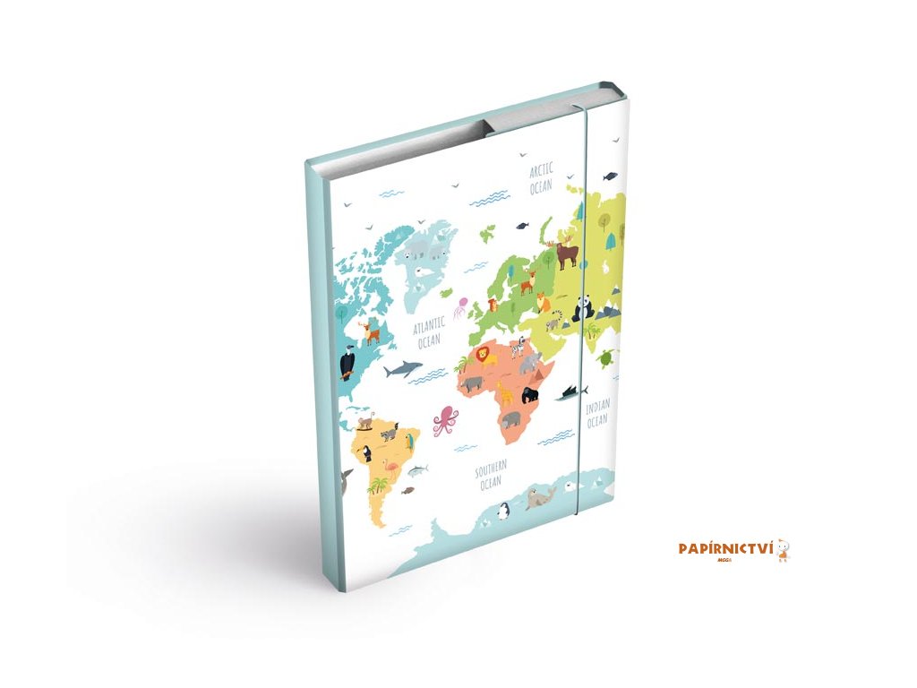 Školní desky na sešity ve velikosti A5 s motivem mapy světa. Jsou nezbytnou součástí vybavení každého školáka. Díky školním deskám budou všechny sešity a učebnice pohromadě a neponičené. Tyto desky na sešity jsou opatřeny gumou, která zabraňuje samovolnému otevření. Heft box je vyroben z kvalitního lepenkového kartonu, potaženého laminem. Z tohoto důvodu se dá velice lehce udržovat.Motiv: mapa světa