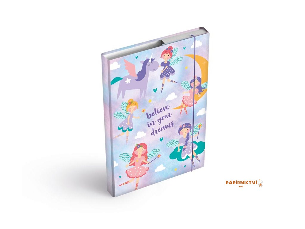 Školní barevné desky na sešity ve velikosti A5 s motivem víl a jednorožce. Jsou nezbytnou součástí vybavení každého školáka. Díky školním deskám budou všechny sešity a učebnice pohromadě a neponičené. Tyto desky na sešity jsou opatřeny gumou, která zabraňuje samovolnému otevření. Heft box je vyroben z kvalitního lepenkového kartonu, potaženého laminem. Z tohoto důvodu se dá velice lehce udržovat.Motiv: víly, jednorožec