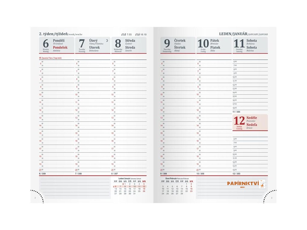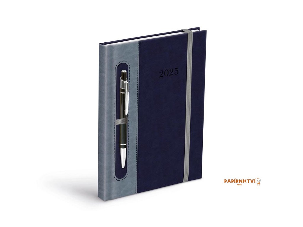 Týdenní diář pro rok 2025 ve formátu A5 s obálkou v elegantní kombinaci tmavě modré a šedé barvy. Obálka je vybavena praktickým poutkem na pero. Povrch obálky je vyroben z měkkého materiálu příjemného na dotek, který zároveň zajišťuje odolnost a dlouhou životnost diáře. Tento diář je ideálním pomocníkem pro efektivní organizaci vašeho času, a navíc nabízí pohodlné uložení pera, abyste ho měli vždy po ruce.DIÁŘ OBSAHUJE: