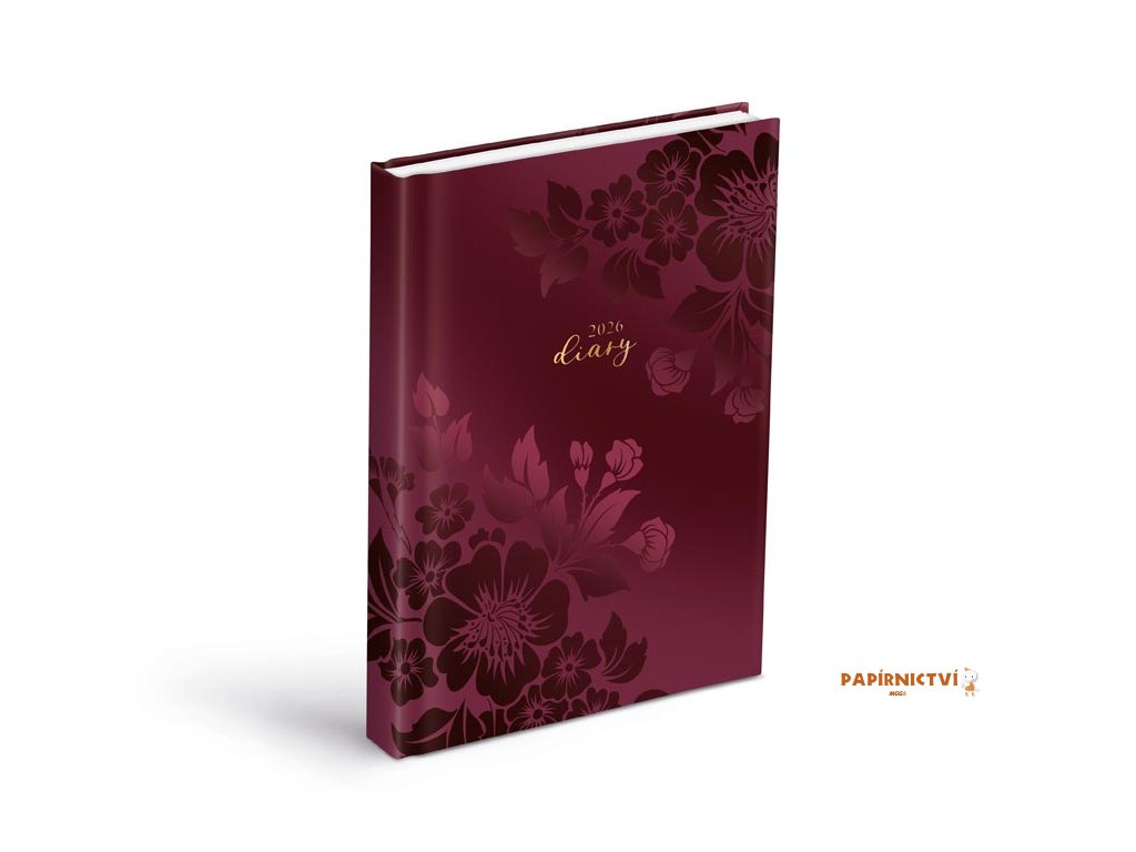 Elegance v každém detailu!Vpusťte do svého plánování nádech luxusu! Tento denní diář ve formátu A5 na rok 2026 zaujme hlubokým vínovým odstínem a rafinovaným květinovým motivem v tónu obálky. Zlaté ražení nápisu „2026 diary“ dodává diáři noblesní vzhled, zatímco lesklé lamino zajišťuje odolnost.