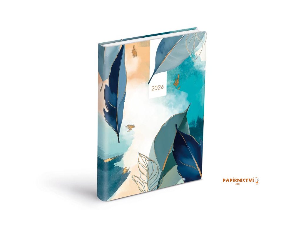 Plánování s nádechem přírody!Denní diář 2026 ve formátu A5 zaujme originálním motivem listů v tónech modré, tyrkysové a béžové s jemnými zlatými akcenty. Design působí svěže, nadčasově a zároveň umělecky – ideální pro ty, kdo mají rádi čistou estetiku a přehlednost.