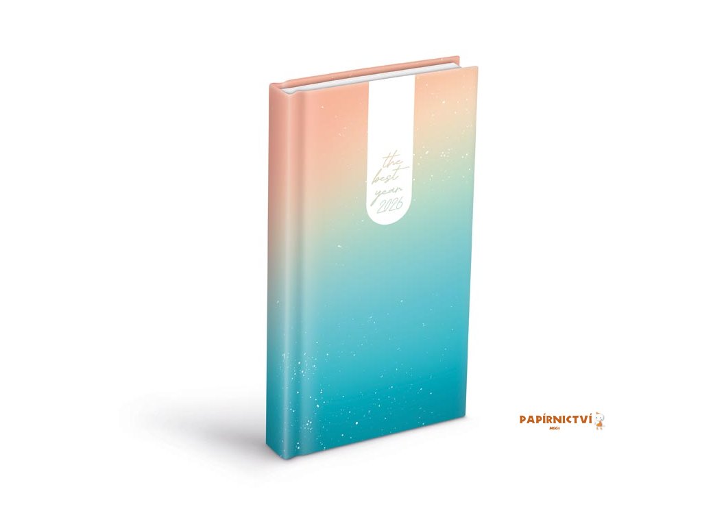 Všechno pod kontrolou!Denní diář pro rok 2026 vyniká svým jemným, ale výrazným designem – pastelový přechod z broskvové do tyrkysové působí jako klidný západ slunce na pobřeží. Bílé hvězdné tečky dodávají lehkost a hravost, zatímco nápis „the best year 2026“ na obálce Vám každý den připomene, že právě letos může být všechno tak, jak chcete.