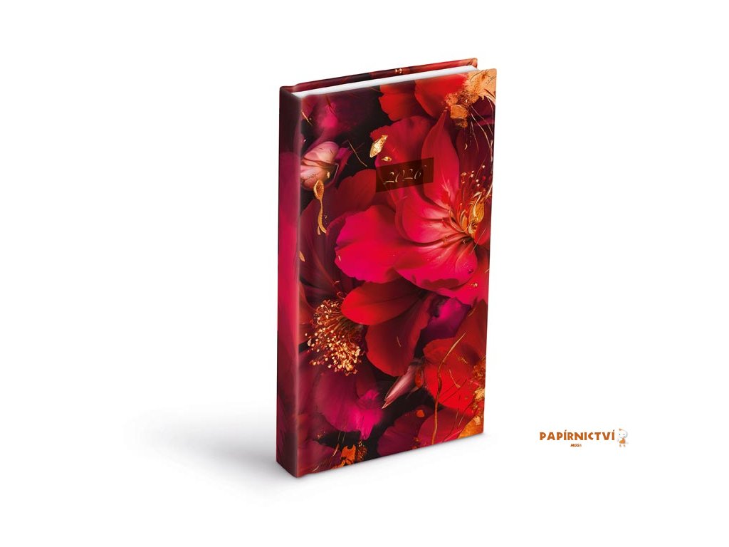 Výrazný vzhled pro výrazný rok!Denní diář 2026 zaujme na první pohled – jeho tmavě červené a vínové květy, doplněné o zlaté detaily, působí jako luxusní látka, která skrývá něco výjimečného. Je odvážný, ale stále vkusný. Elegantní, ale nepřehlédnutelný.