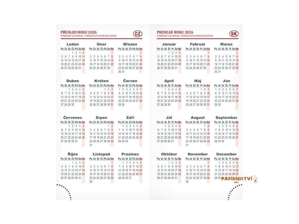 Povrch z odolného PVC materiálu je snadno omyvatelný a dobře odolává každodenní manipulaci. Odtrhávací rožky pomáhají udržet přehled a rychle najít aktuální datum bez zdlouhavého listování.