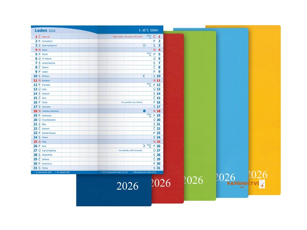 Štíhlý formát se pohodlně vejde do kabelky, tašky nebo šuplíku. Je lehký, praktický a ideální jako přehledný pracovní i osobní pomocník.