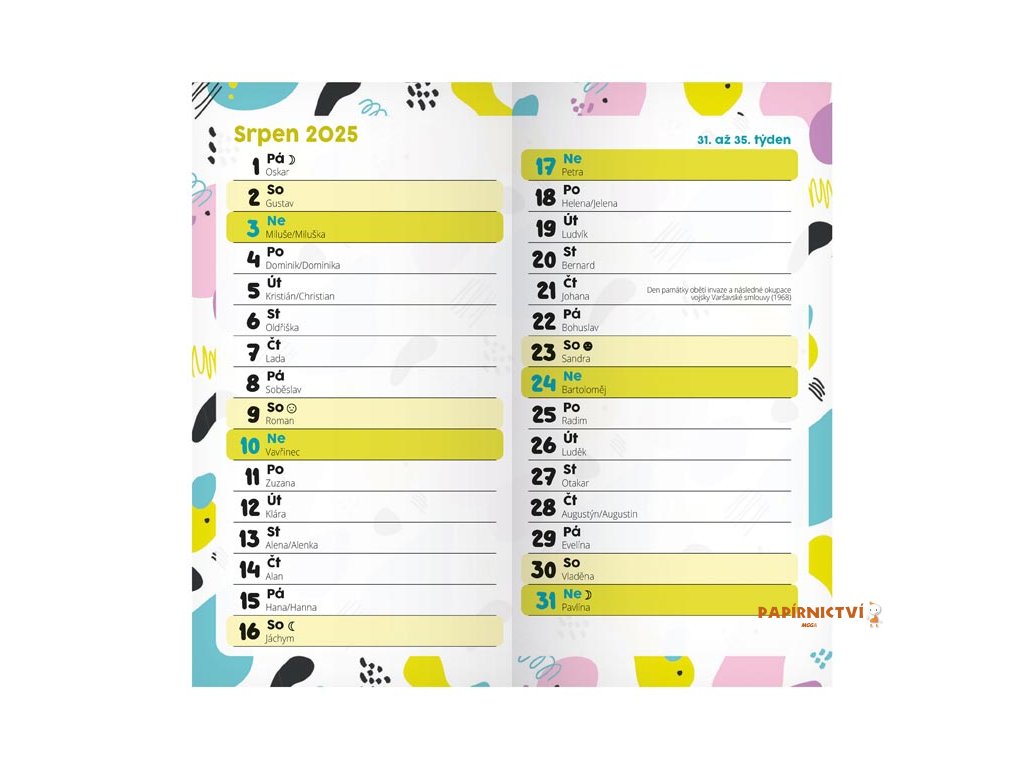 Přehled pro každý školní den!Školní měsíční diář pro rok 2025/2026 je ideálním pomocníkem pro organizaci školních povinností i mimoškolních aktivit. Díky přehlednému měsíčnímu kalendáriu mají děti všechno pod kontrolou – od termínů úkolů až po volnočasové aktivity.