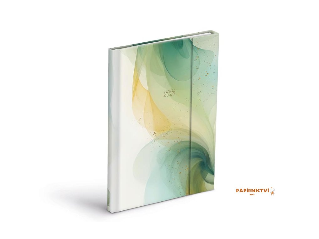 Když plánování dostane podobu!Týdenní diář na rok 2026 ve formátu A5 zaujme jemným, abstraktním motivem, který připomíná vířící akvarelový dým v tónech zelené, žluté a zlatavé. Motiv působí klidně, vzdušně a přirozeně doplní pracovní i osobní prostor.
