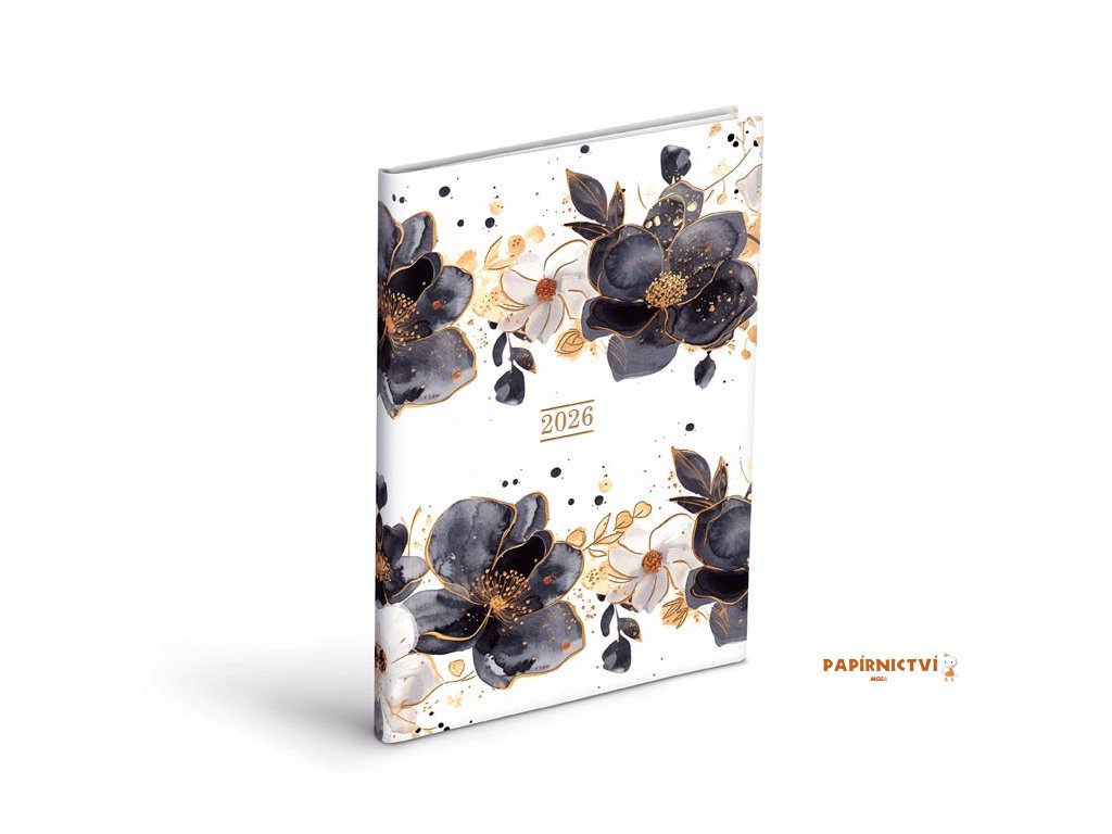 Praktický, krásný a připravený na všechno!Týdenní diář 2026 ve formátu A5 spojuje výrazný květinový design s jemnou estetikou. Černé a zlaté květy na čistě bílém podkladu vytvářejí dojem nadčasové elegance, která se hodí do práce, kabelky i na pracovní stůl.