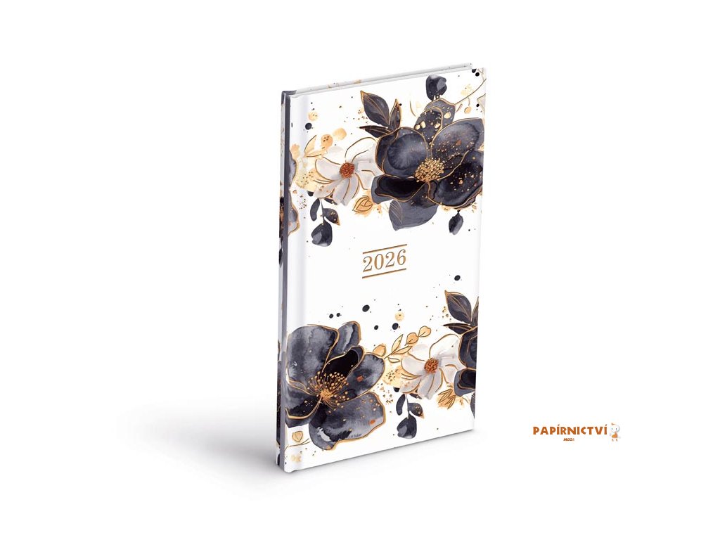 Váš společník po celý rok!Týdenní diář na rok 2026 je kombinací elegance a jemnosti. Jeho bílá plocha je pokryta výraznými květinovými motivy v černé a zlaté barvě. Tento design má romantický nádech, ale zároveň je moderní.