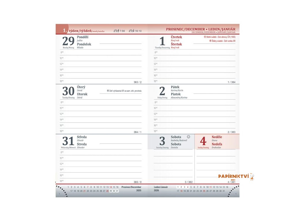 Povrch z odolného PVC materiálu je jednoduchý na údržbu a vydrží každodenní používání. odtrhávací rožky vám zajistí rychlou orientaci a pohodlný přístup k aktuálnímu týdnu.
