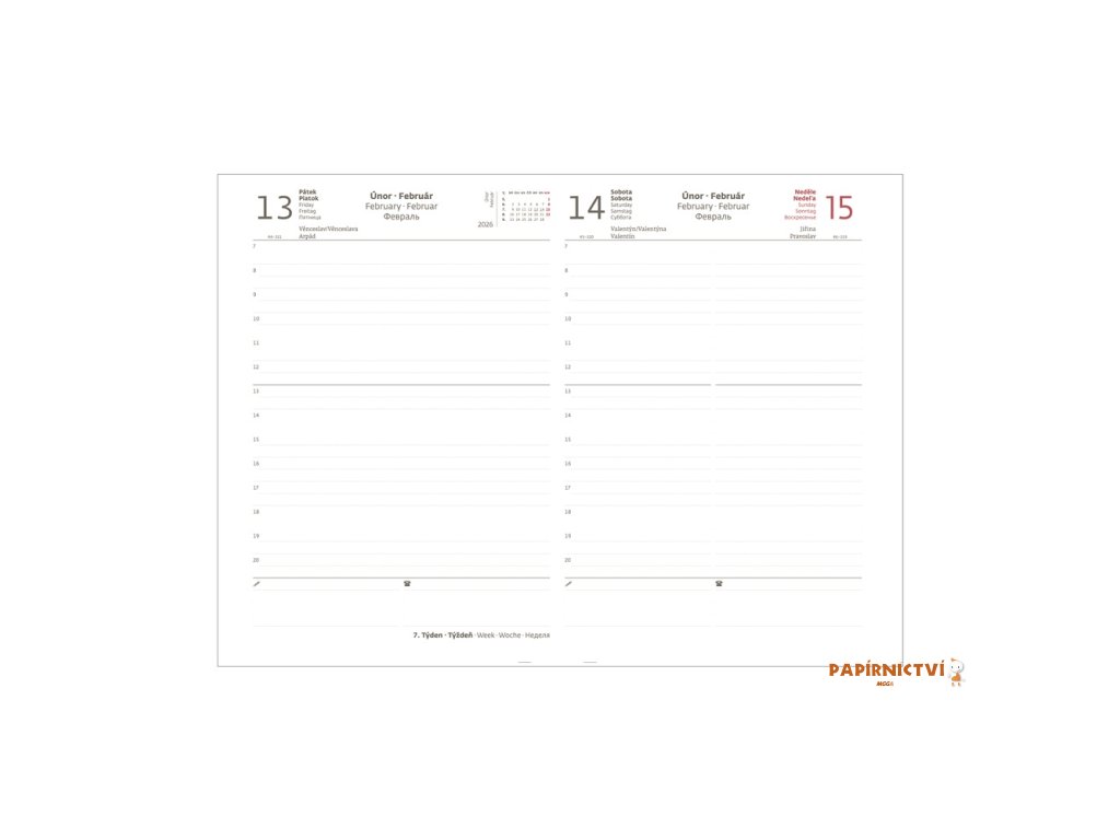 Diář A5 s denním rozvrhem z kolekce VERDE obsahuje 352 stran a je ideální pro ty, kdo vyžadují podrobné denní plánování. Povrchová úprava Soft touch lamino mat s UV lakem zajišťuje diáři nejen elegantní vzhled, ale i odolnost proti opotřebení. Diář obsahuje mnoho praktických informačních stránek: osobní údaje, plánovací kalendář pro rok 2026, přehledný kalendář pro roky 2026/2027, seznam křestních jmen a mezinárodních svátků, mezinárodní telefonní předvolby a důležitá telefonní čísla, prostor pro poznámky a plánovač dovolené. Kalendárium zahrnuje jména a státní svátky v češtině a slovenštině, dny a měsíce v pěti jazycích (čeština, slovenština, němčina, angličtina, ruština), počet dnů od začátku do konce roku, měsíční fáze a mapy České republiky, Slovenska a Evropské unie. Další vlastnosti jako kulaté rohy a perforace pro snadné odtrhávání stránek zvyšují uživatelský komfort a funkčnost diáře.