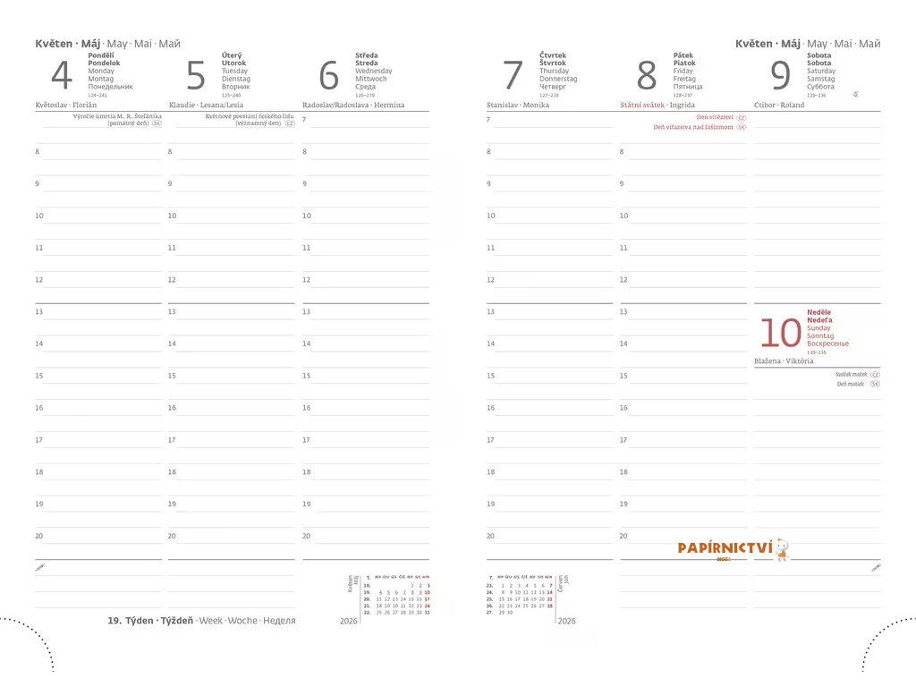 Diář obsahuje: osobní údaje, plánovač dovolené (měsíční přehled), plánovací kalendář, telefonní předvolby, státní svátky České a Slovenské republiky, mezinárodní svátky, roční výhled, týdenní layout, adresář, mapa Evropy a České a Slovenské republiky