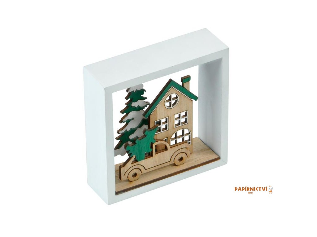 Vánoční ozdoba s motivem auta, domu a zasněženého stromu. Krásně ozdobí váš interiér nebo exteriér a umocní tak vánoční atmosféru.Materiál: Dřevo