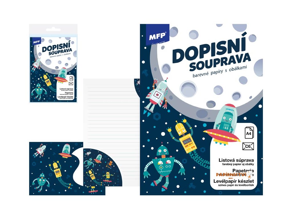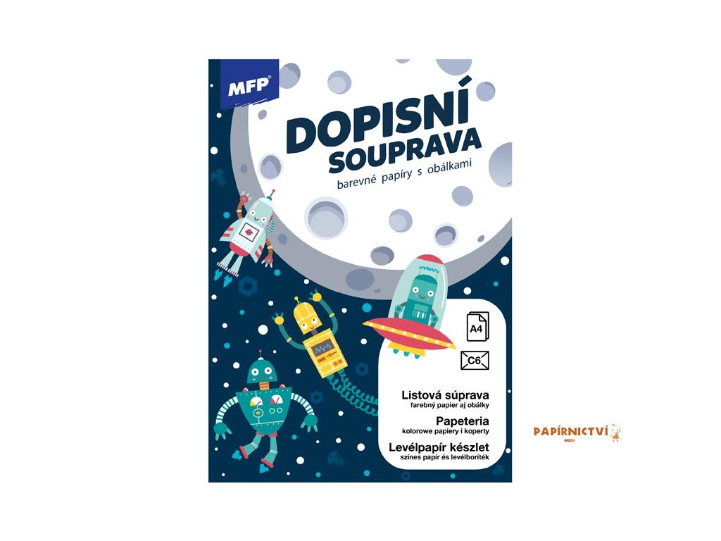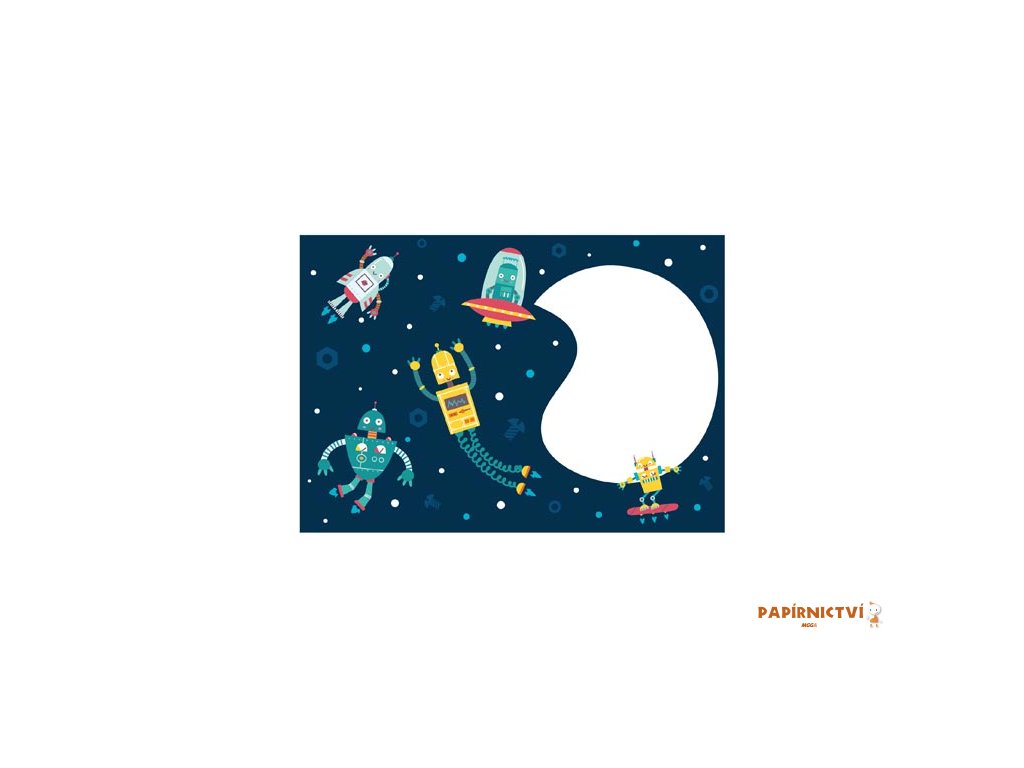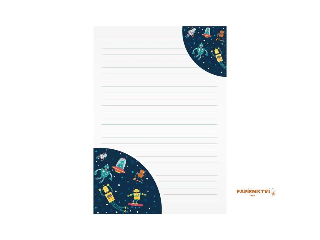 Vesmírná sada pro vaše psaní!S dopisní sadou Vesmír získáte skvělou kombinaci linkovaných listů s veselými vesmírnými motivy. Každý dopis snadno doplníte stylovou barevnou obálkou s motivy robotů a raket, připravených na dobrodružství.