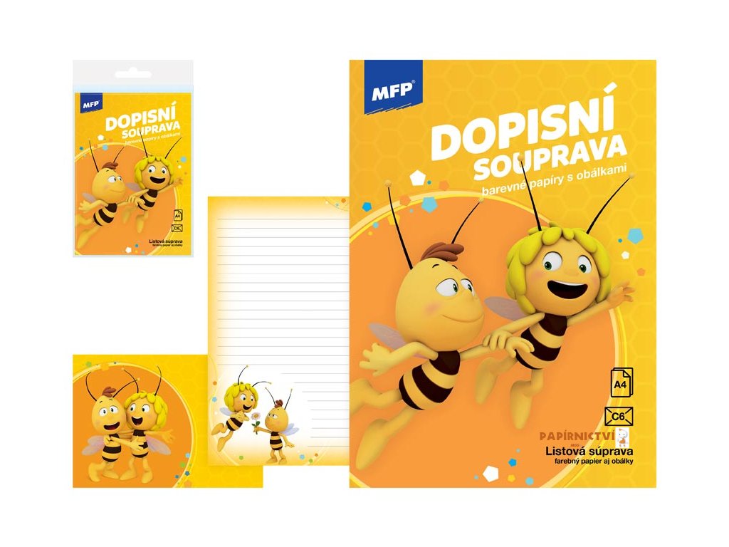 Dopisní souprava s obrázkem ze známé pohádky Včelka Mája. Včelka mája je zde i s Vilíkem. Píšete rádi dopisy svým známým? Pořiďte si u nás krásné dopisní papíry s různými motivy a nezapomeňte ani na psací potřeby.BALENÍ OBSAHUJE: