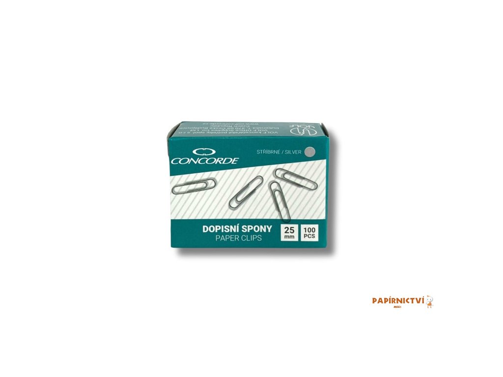 Dopisní spony velikosti 25mm stríbrné barvy. Balení obsahuje 100 kusu spon.Doplňkové parametry