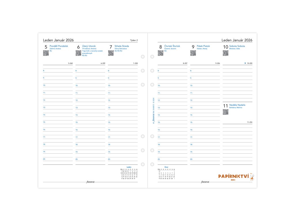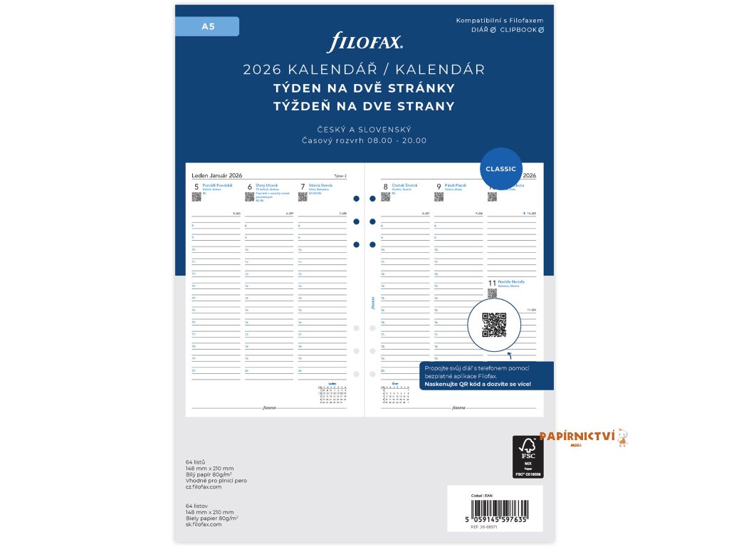 Filofax, kalendář 2026 A5, týden/ 2 strana, linky, ČJ+SJ