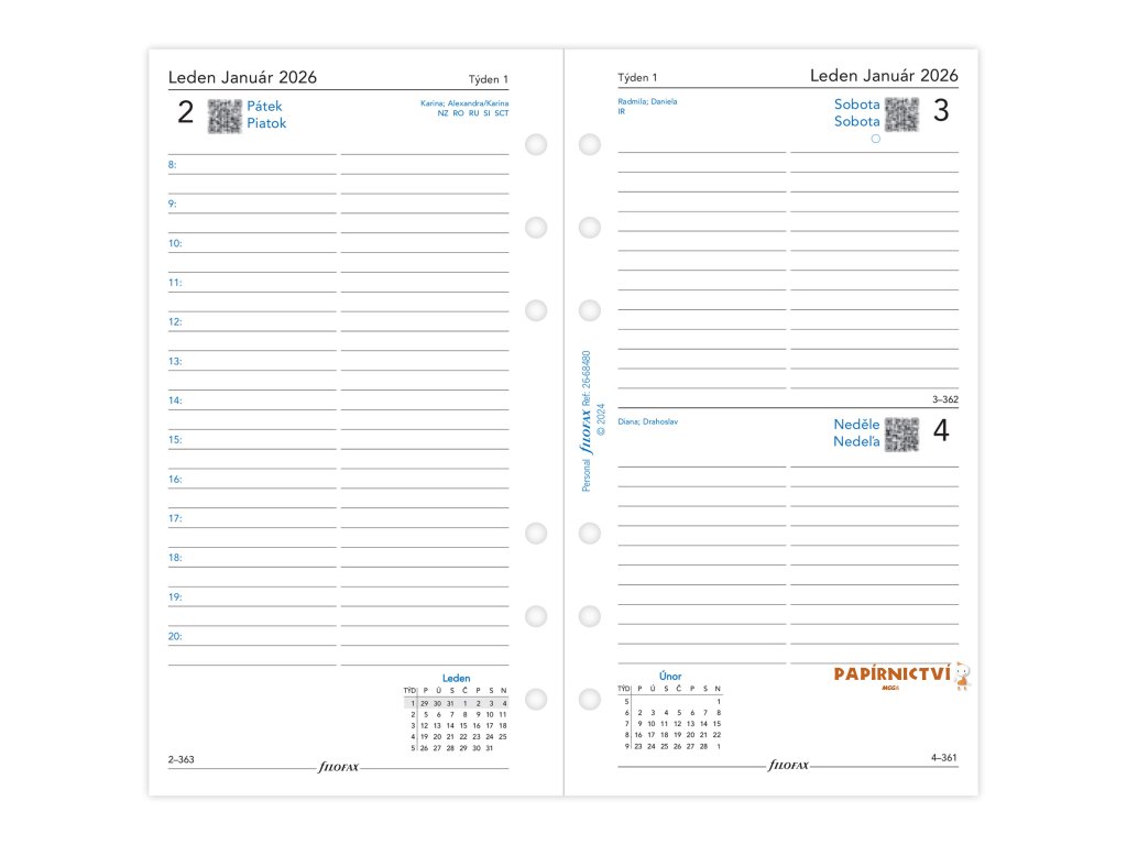 Filofax, kalendář 2026 osobní, den/ 1 strana, linky, ČJ+SJ