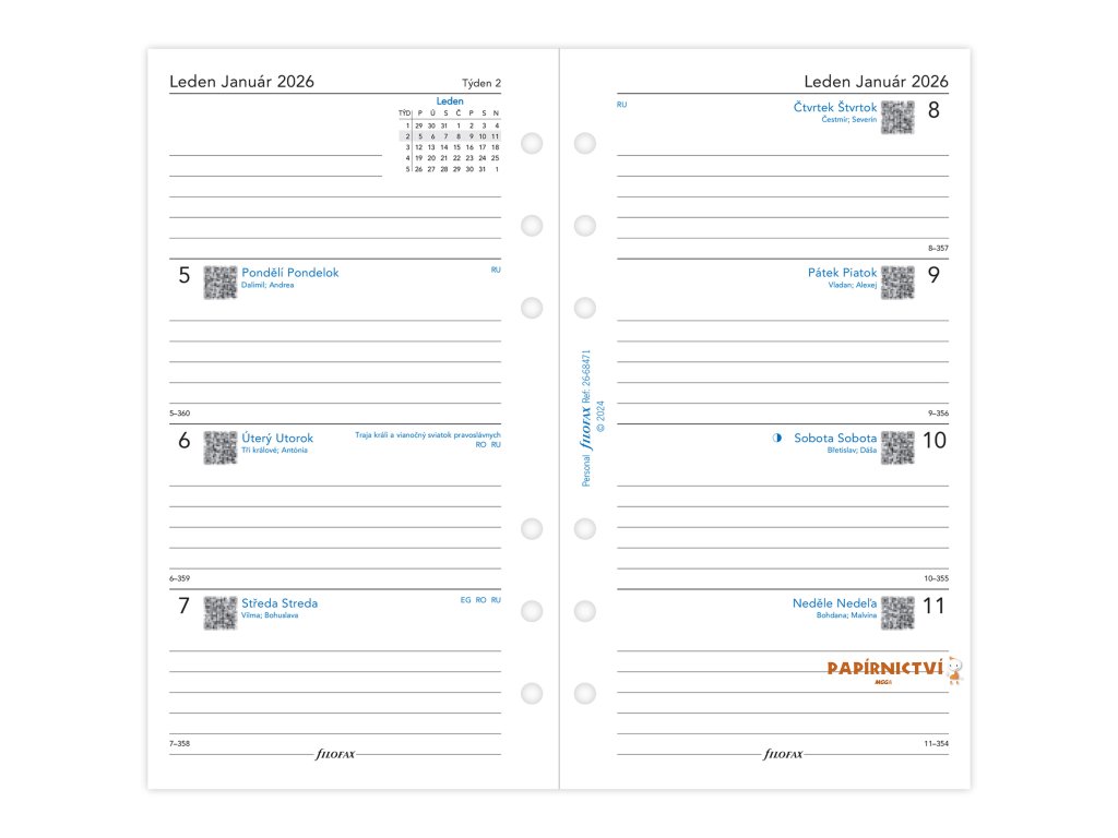 Filofax, kalendář 2026 osobní, den/ 1 strana, linky, ČJ+SJ