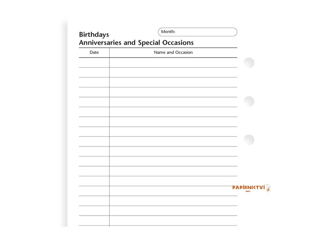 Filofax, Přehled narozenin, výročí dalších událostí pro diáře, kapesní, bílá